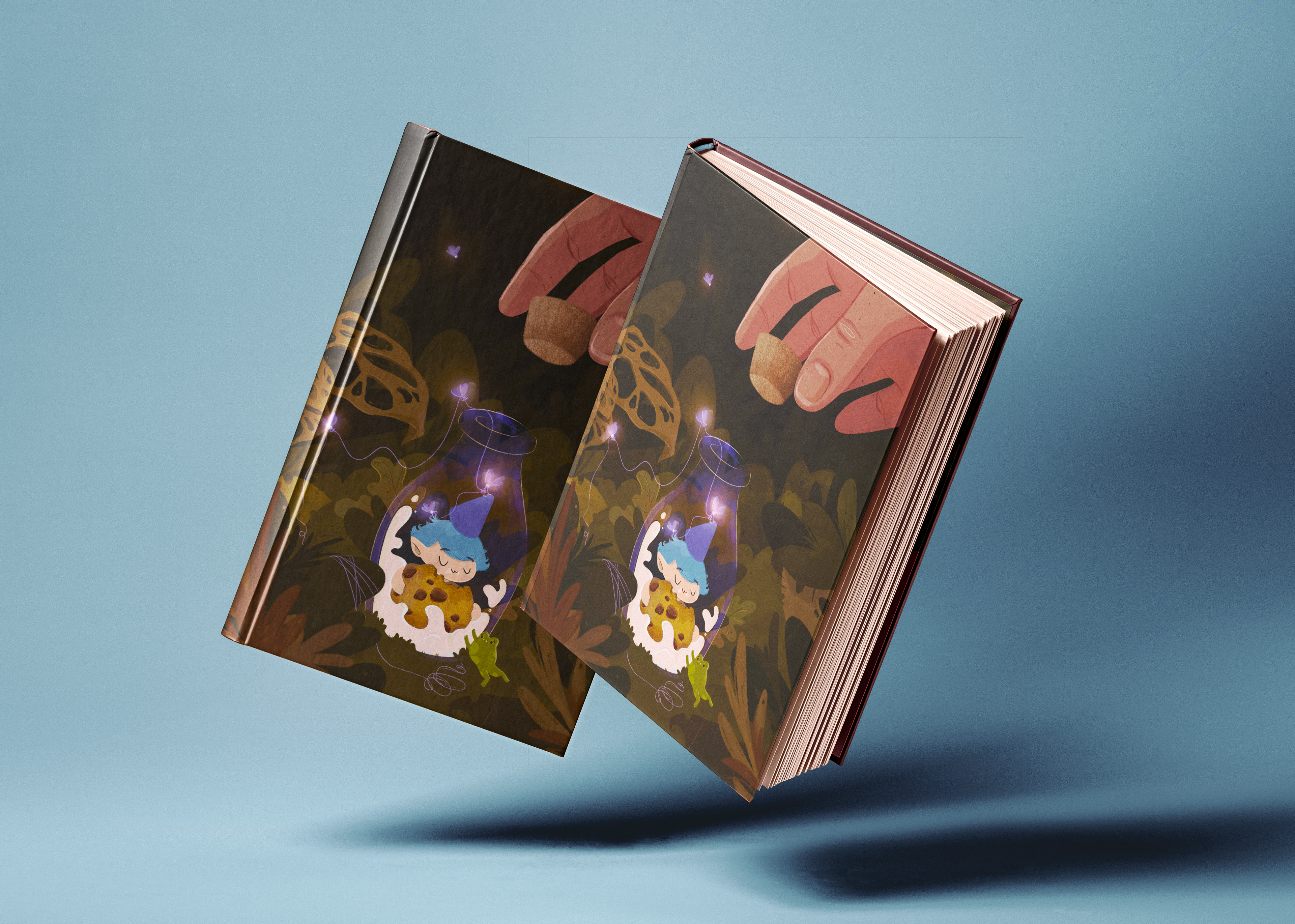 A tiny figure trapped in a milk bottle, too distracted by their cookie to notice the hand about to seal them in... or the glowing insects desperately trying to warn them.